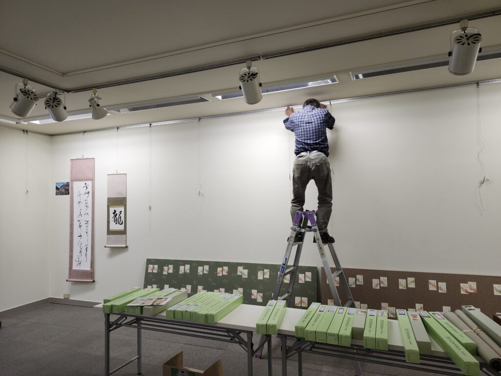 4面に陳列が終わったのは15時。表具屋さんはお帰りになり、我々(私と夫)はキャプションを壁に張るなど16時半迄、調整しました。準備万端!